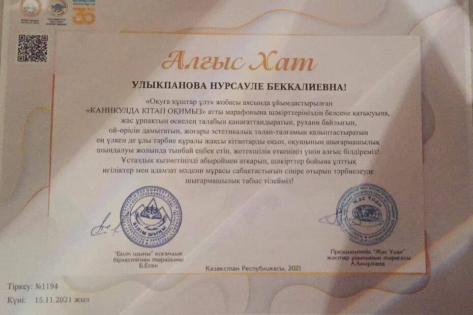 “Оқуға құштар ұлт” жобасы аясында ұйымдастырылған “Каникулда кітап оқимыз”атты марафонның…Қараша 17, 2021